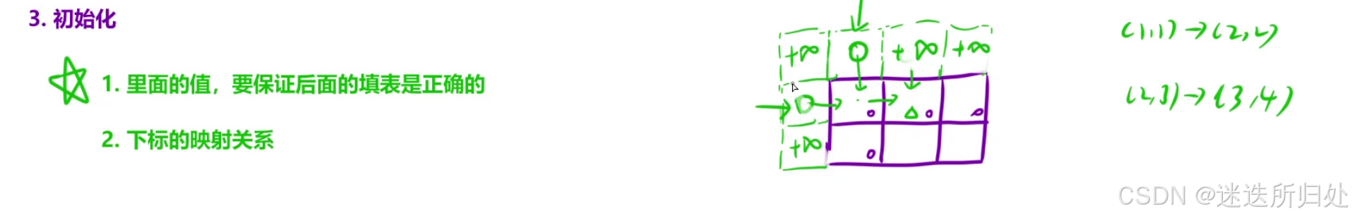 初始化时可以先将所有的虚拟节点初始化为正无穷大,然后再把原始矩阵的第一个值的上方和左边的虚拟节点初始化为0,因为不能让虚拟节点的值干扰到原始矩阵节点的值 本题的下标映射关系:因为本题给了一个矩阵,而我们又额外的加上一行和一列的虚拟节点,所以我们的下标都统一往右下角移动了一位,如果想找回之前对应的位置,那么下标需要进行统一减1(横纵坐标)