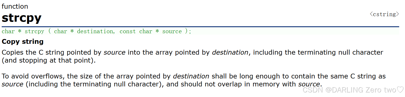 参数:destination-指向要复制内容的目标数组的指针,source-要复制的 C 字符串(注意原字符串不可修改)