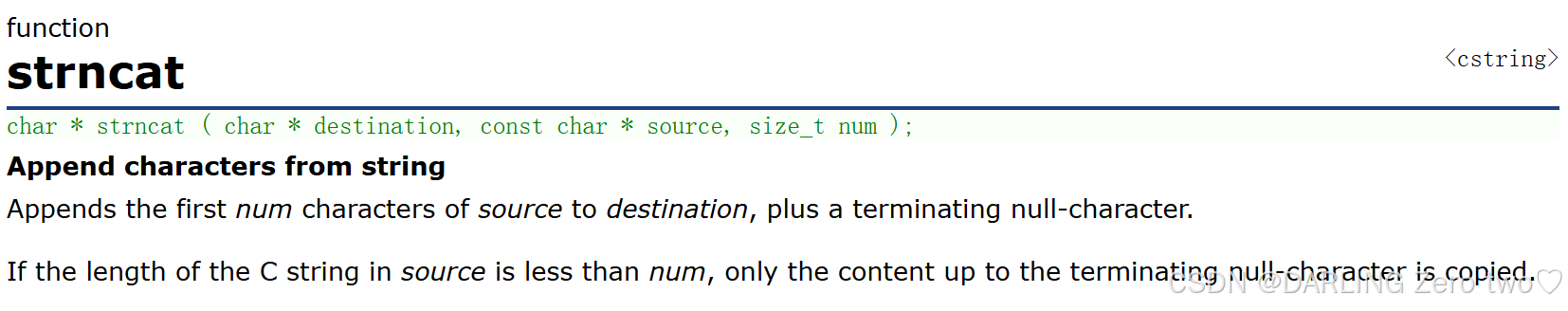 值得注意的是:在指定的连接字符个数中是不包括\0的,将 source 指向字符串的前 num 个字符追加到 destination 指向的字符串末尾,再追加⼀个 \0 字符,如果 source 指向的字符串的长度小于 num 的时候,只会将字符串中到 \0 的内容追加到 destination 指向的字符串末尾