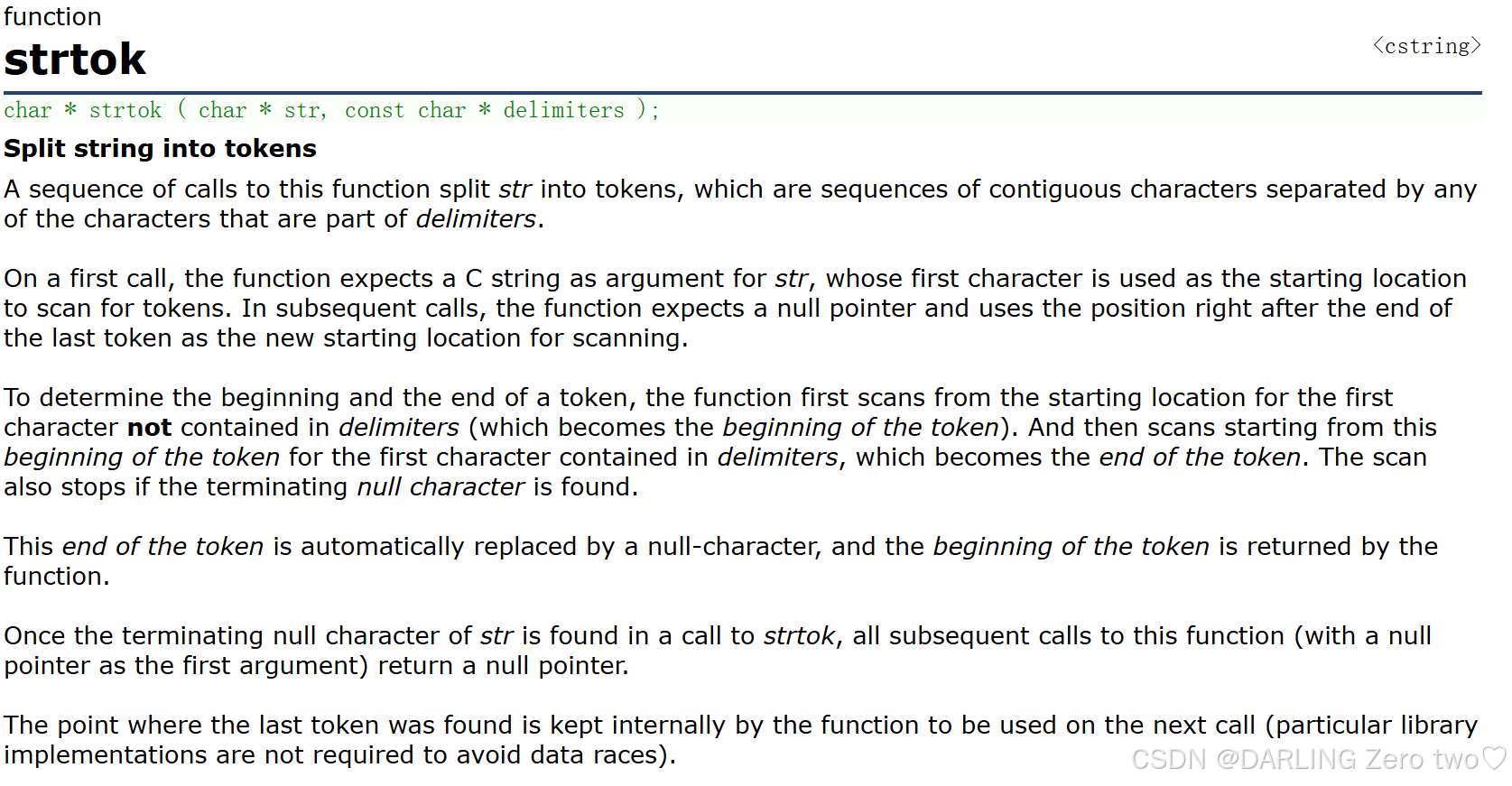 值得注意的是:sep 参数指向一个字符串,定义了用作分隔符的字符集合,第⼀个参数指定⼀个字符串,它包含了 0 个或者多个由 sep 字符串中⼀个或者多个分隔符分割的标记 strtok 函数找到 str 中的下⼀个标记,并将其用 \0 结尾,返回⼀个指向这个标记的指针。(注:strtok函数会改变被操作的字符串,所以被strtok函数切分的字符串⼀般都是临时拷贝的内容并且可修改),strtok函数的第一个参数不为 NULL ,函数将找到str中第一个标记,strtok 函数将保存它在字符串中的位置,strtok 函数的第一个参数为 NULL ,函数将在同一个字符串中被保存的位置开始,查找下一个标记,如果字符串中不存在更多的标记,则返回 NULL 指针