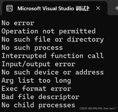 在不同的系统和C语言标准库的实现中都规定了一些错误码,一般是放在 errno.h 这个头文件中说明的,C语言程序启动的时候就会使用一个全局的变量 errno 来记录程序的当前错误码,只不过程序启动的时候 errno 是0,表示没有错误,当我们在使用标准库中的函数的时候发生了某种错误,就会将对应的错误码,存放在 errno 中,而⼀个错误码的数字是整数很难理解是什么意思,所以每一个错误码都是有对应的错误信息的,strerror 函数就可以将错误对应的错误信息字符串的地址返回