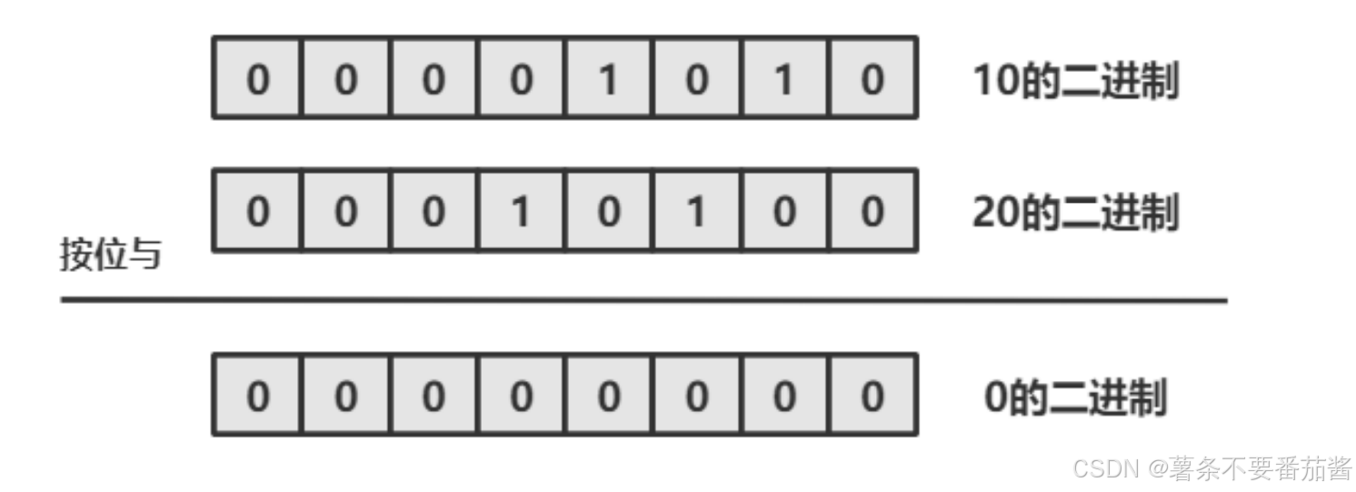 System.out.println(a & b);//输出0进行按位运算 , 需要先把 10 和 20 转成二进制 , 分别为 1010 和 10100