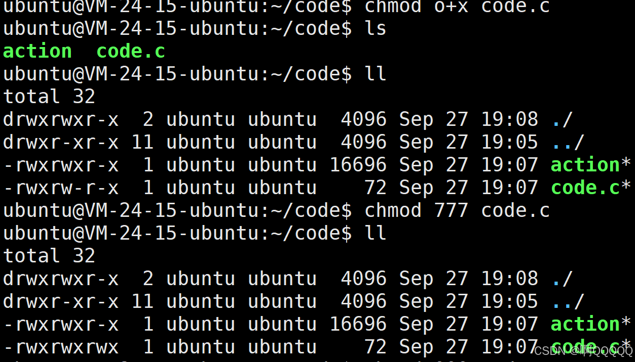 r(可读):是否可以看到目录下的所有文件(也就是是否可以使用指令ls); w(可写):是否可以对当前目录进行新建(mkdir,touch)/修改(mv,mano...)/删除(rm)等操作; x(可执行):这个权限很重要,如果没有这个权限那么我们甚至都进不去目录中,更不用说看见目录下的文件了;