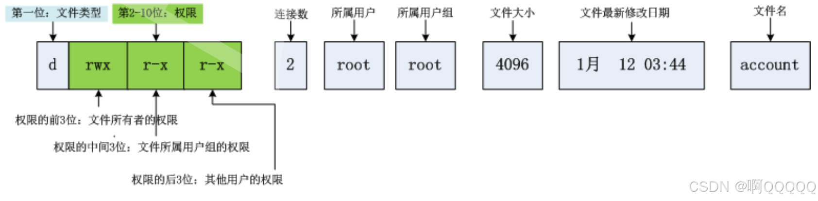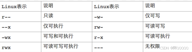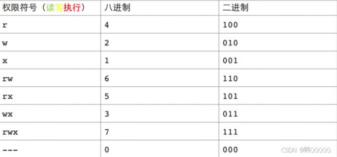 i. 读( r/4 ): Read 对文件而言,具有读取文件内容的权限;对目录来说,具有浏览该目录信息的权限 ii. 写( w/2 ): Write 对文件而言,具有修改文件内容的权限;对目录来说具有删除移动目录内文件的权限 iii. 执行( x/1 ): execute 对文件而言,具有执行文件的权限;对目录来说,具有进入目录的权限 iv.“—” 表示不具有该项权限