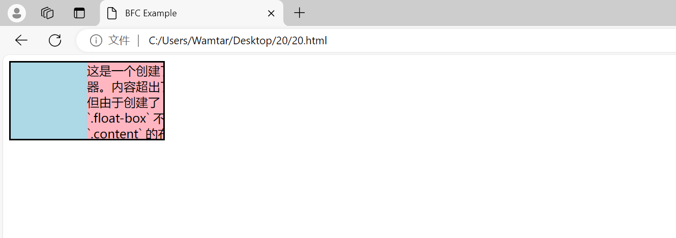这是一个创建了 BFC 的容器。内容超出了容器边界,但由于创建了 BFC,浮动的 `.float-box` 不会影响到 `.content` 的布局。