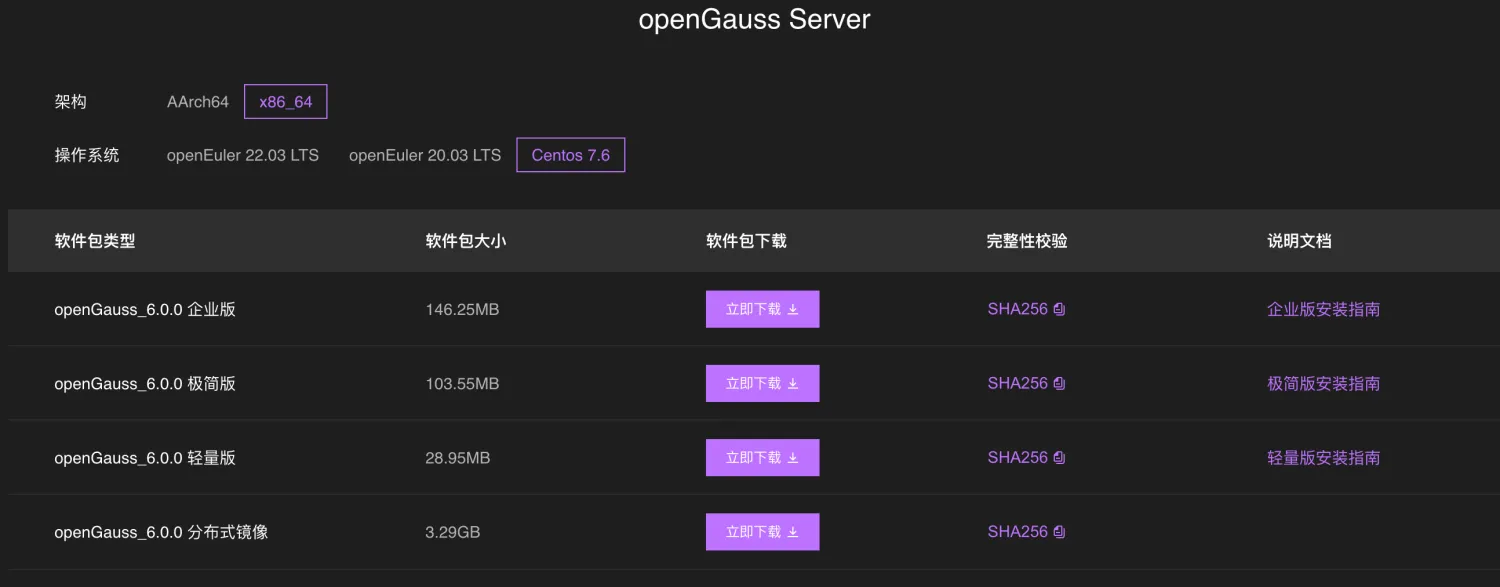 下载 openGauss 6.0.0 (LTS) 可以从官方网站下载,官网地址为:https://opengauss.org/zh/download/。openGauss Server 支持 AArch x64位架构和 x86_64位架构。操作系统支持的情况就比较少,目前支持 openEuler 20.03 LTS 、openEuler 22.03 LTS 、CentOS 7.6、Kylin V10、Asianux 7.5(7.6)、UOS V20,目前我这里只有GUN/Linux(CentOS)操作系统(后续抽空再在Kylin V10、UOS V20 做一下安装的博文)。官方提供了四种类型的软件包,分别为企业版、极简版、轻量版和分布式镜像。可以按照自己极其的支撑情况,下载安装,尝试新鲜。具体的安装可以参考官网文档:安装 openGauss 。