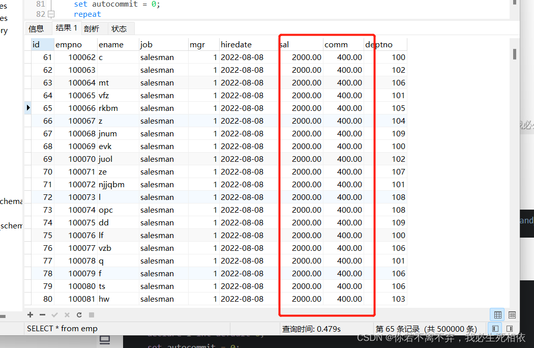 insert into emp(empno,ename,job,mgr,hiredate,sal,comm,deptno) values((start+i),rand_string(6),'salesman',0001,curdate(),2000,400,rand_num());