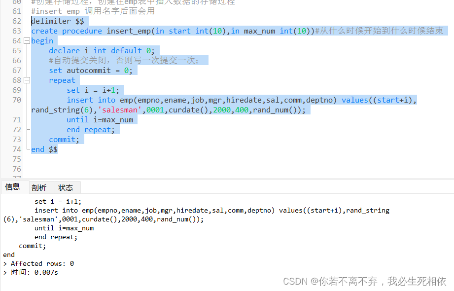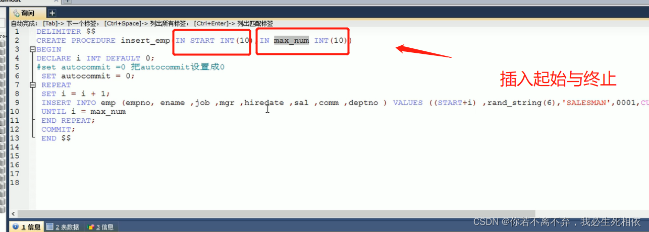 create procedure insert_emp(in start int(10),in max_num int(10))#从什么时候开始到什么时候结束