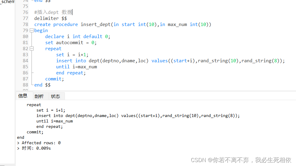 insert into emp(empno,ename,job,mgr,hiredate,sal,comm,deptno) values((start+i),rand_string(6),'salesman',0001,curdate(),2000,400,rand_num());创建往dept表中插入数据的存储过程