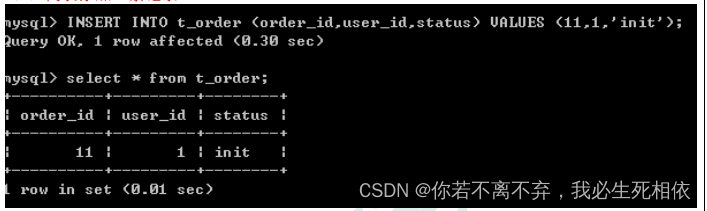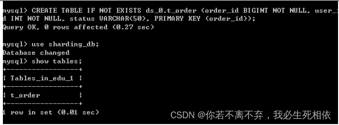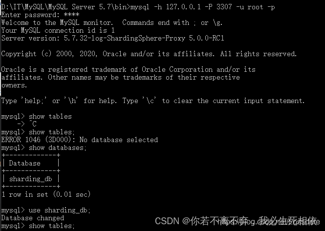 ( 1 )打开cmd窗口连接Sharding-Proxy,连接方式和连接mysql一样的 ( 2 )进行sql命令操作看到只有一个库