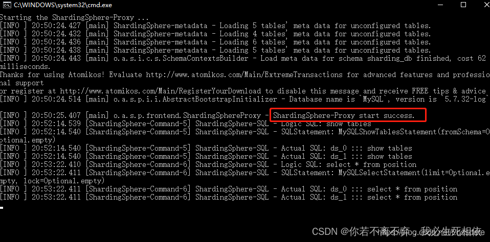 Linux操作系统请运行bin/start.sh,Windows操作系统请运行bin/start.bat启动Sharding-Proxy
