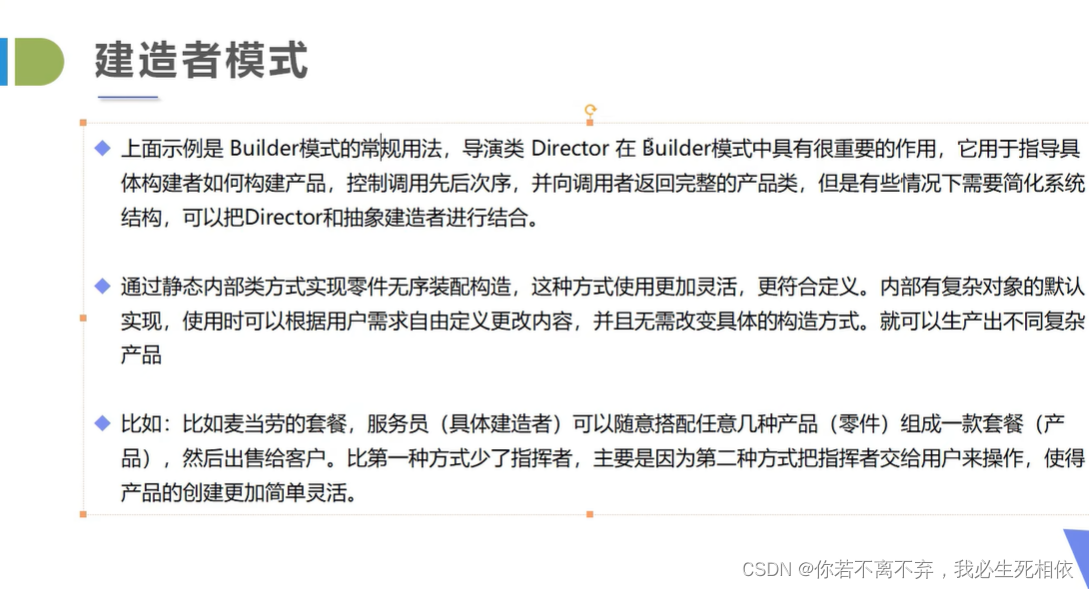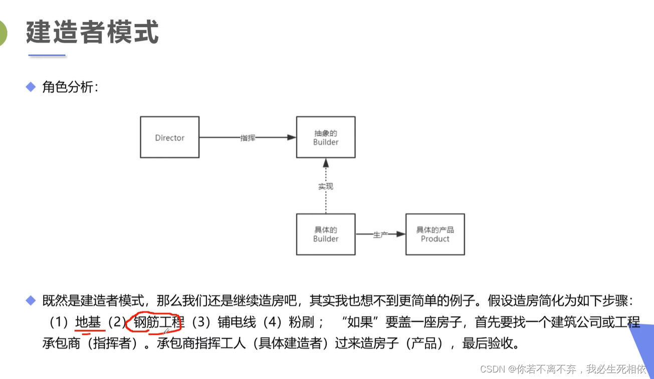 注意事项:与工厂模式的区别是:建造者模式更加关注与零件装配的顺序。