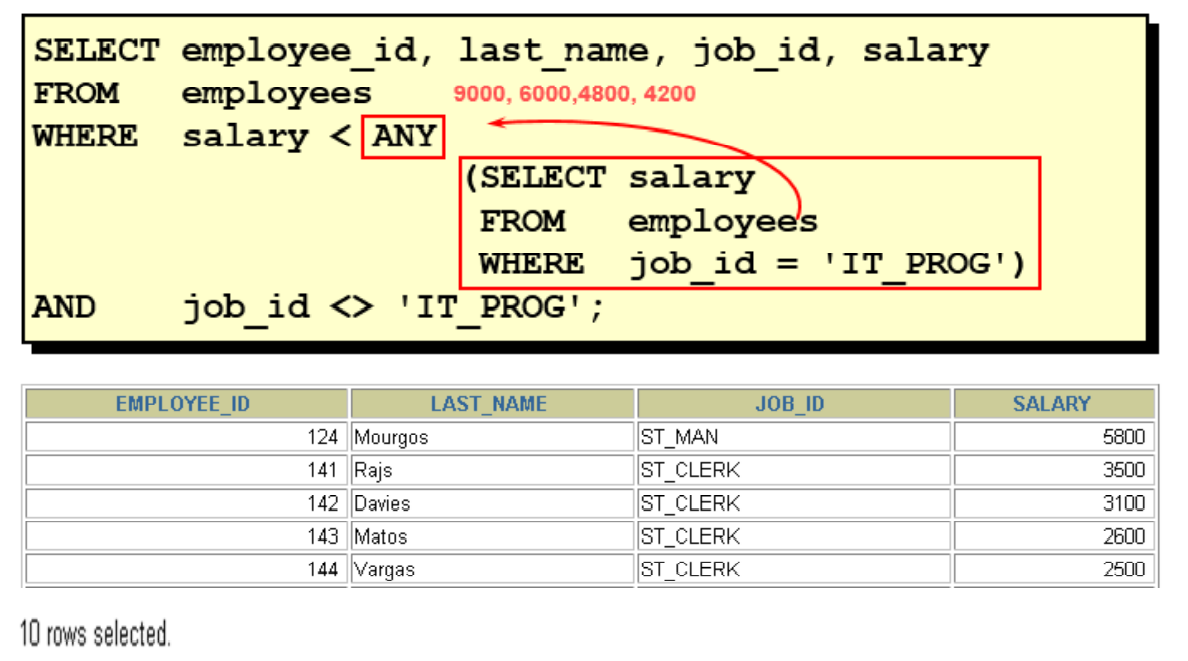 ANY | 需要和单行比较操作符一起使用,和子查询返回的某一个值比较 |