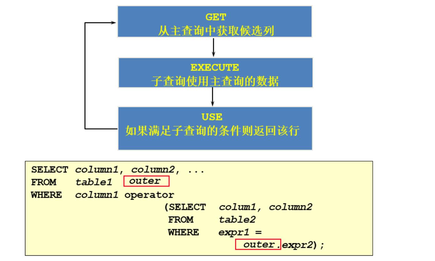 相关子查询按照一行接一行的顺序执行,主查询的每一行都执行一次子查询。