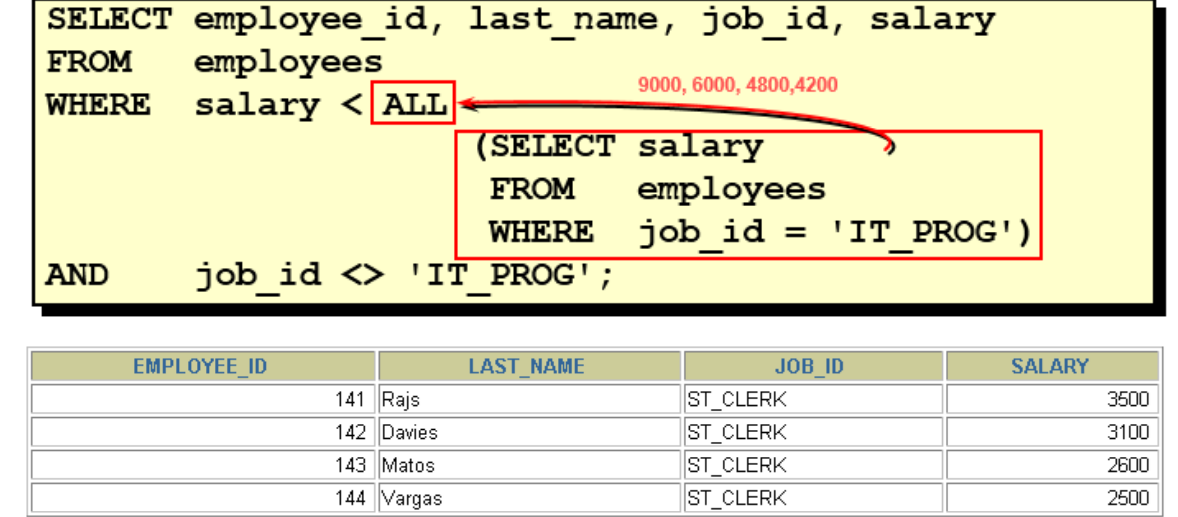 题目:返回其它job_id中比job_id为‘IT_PROG’部门所有工资都低的员工的员工号、姓名、job_id以及salary