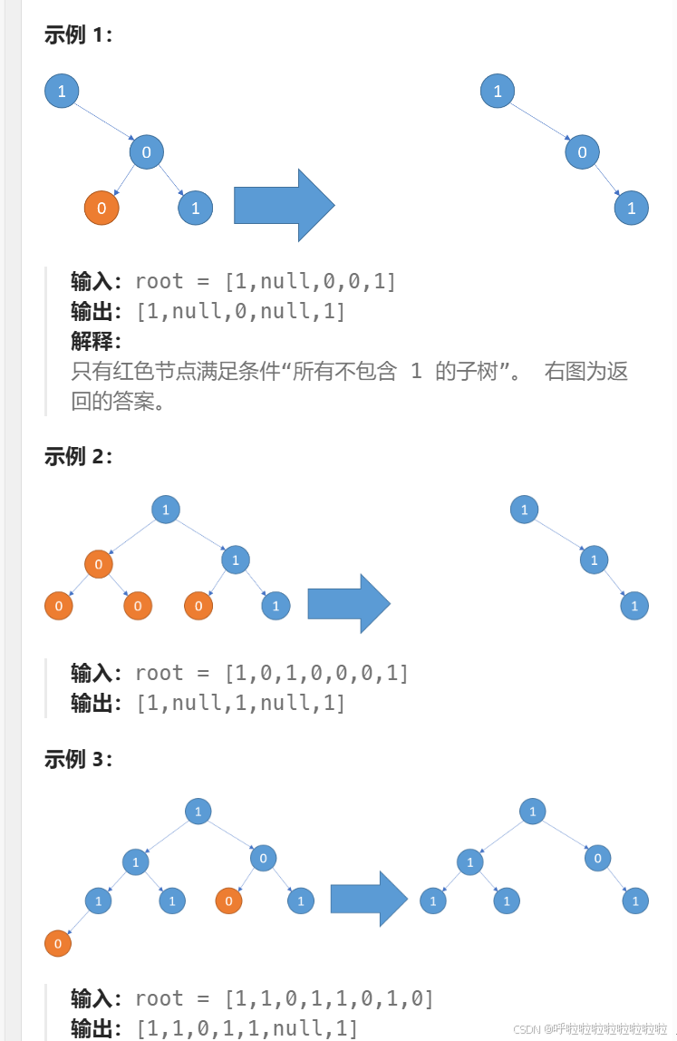 思路: 叶子节点为0 直接让它指向空 后序遍历思想 1.遍历完左子树 再遍历右子树 2. 如果遇到叶子节点 则判断当前节点是否为0 3.如果为0 则直接返回null 否则不需要剪枝 直接返回原来值