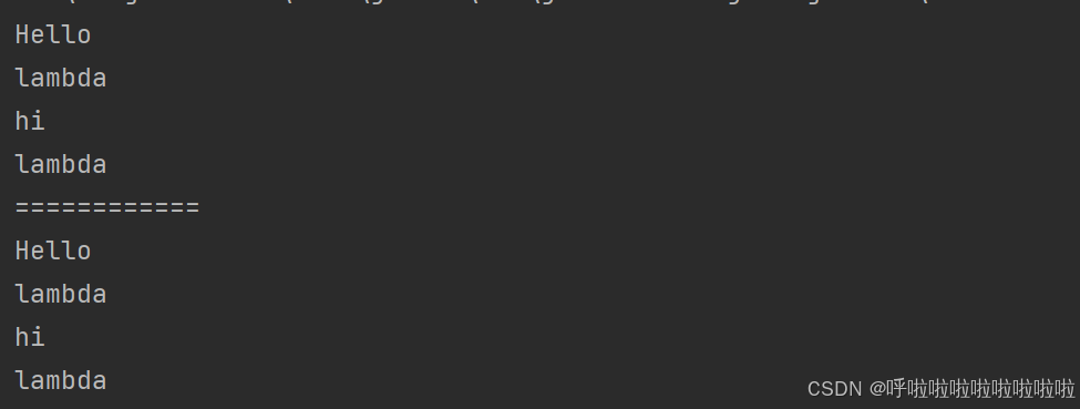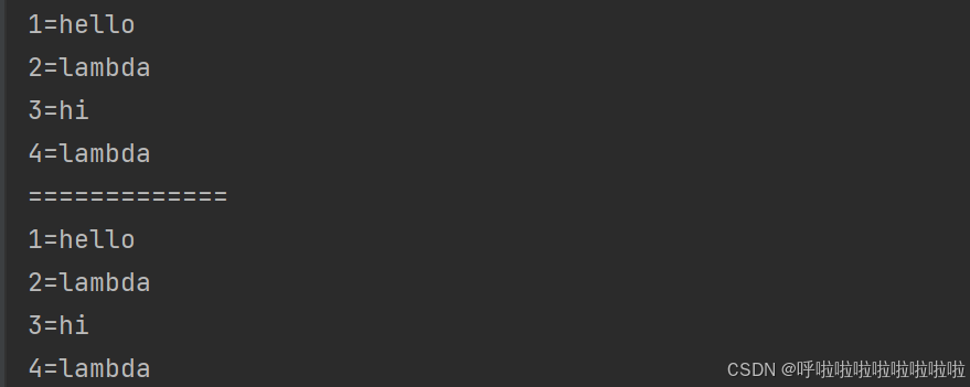 语法精简: 1. 参数类型可以省略,如果需要省略,每个参数的类型都要省略。 2. 参数的小括号里面只有一个参数,那么小括号可以省略 3. 如果方法体当中只有一句代码,那么大括号可以省略 4. 如果方法体中只有一条语句,且是return语句,那么大括号可以省略,且去掉return关键字