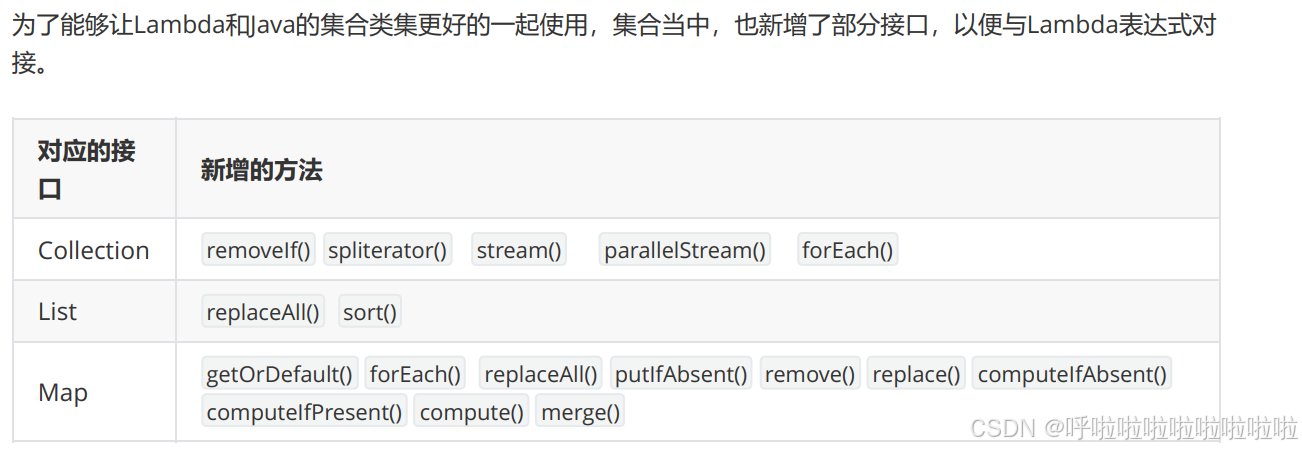 基本语法: (parameters) -> expression 或 (parameters) ->{ statements; } Lambda表达式由三部分组成: 1. paramaters:类似方法中的形参列表,这里的参数是函数式接口里的参数。这里的参数类型可以明确的声明 也可不声明而由JVM隐含的推断。另外当只有一个推断类型时可以省略掉圆括号。 2. ->:可理解为“被用于”的意思 3. 方法体:可以是表达式也可以代码块,是函数式接口里方法的实现。代码块可返回一个值或者什么都不反 回,这里的代码块块等同于方法的方法体。如果是表达式,也可以返回一个值或者什么都不反回