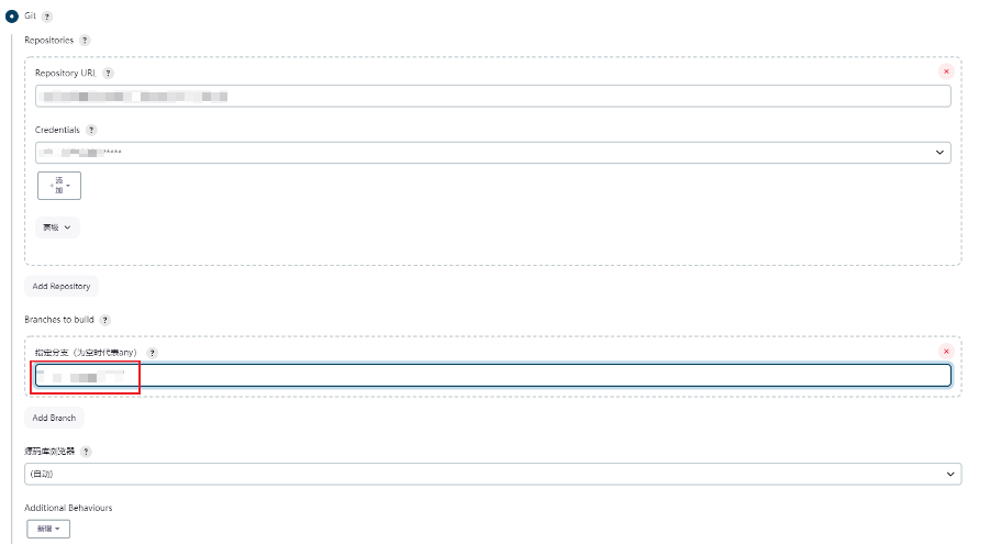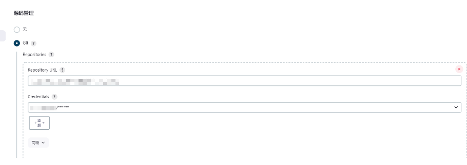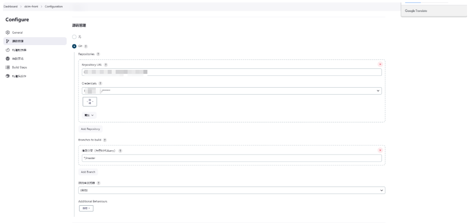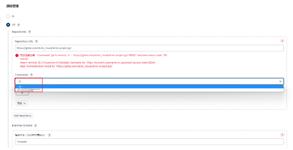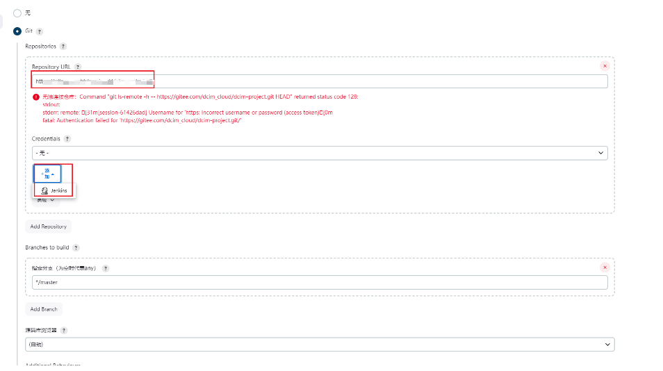 输入如下的前端构建地址,选择有权限的用户,这里举例比如前端分支默认是master