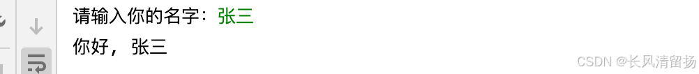 # 运行这段代码后,程序将显示“请输入你的名字:”作为提示,等待用户输入名字,然后打印出问候语。