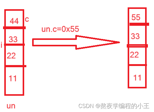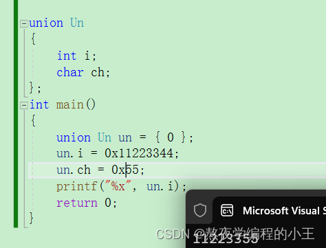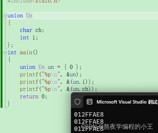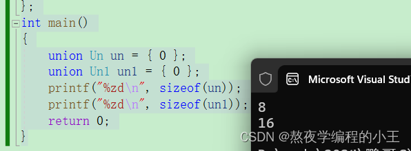 #include<stdio.h> //联合类型的声明 union UN { char ch; int i; }; int main() { //联合变量定义 union UN un = { 0 }; un.i = 1; printf("%zd", sizeof(un)); return 0; }