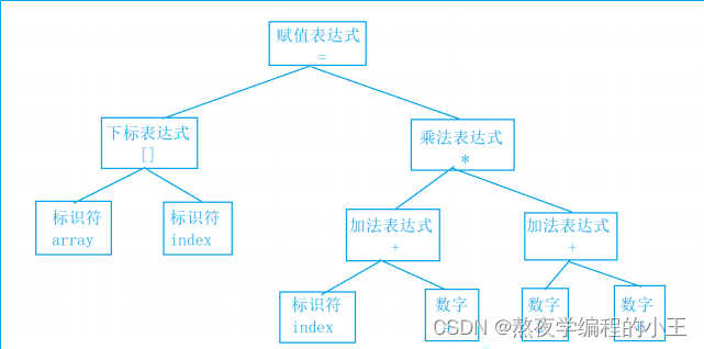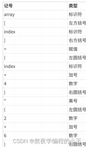 array[inedx]=(index+4)*(2+6);将源代码程序被输入扫描器,扫描器的任务就是简单的进行词法分析,将代码中的字符分割成一系列的记号(关键字、标识符、字面量、特殊字符等)。