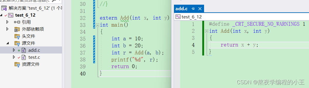 在一个c项目中有2个文件(test.c)和(add.c),代码如下: