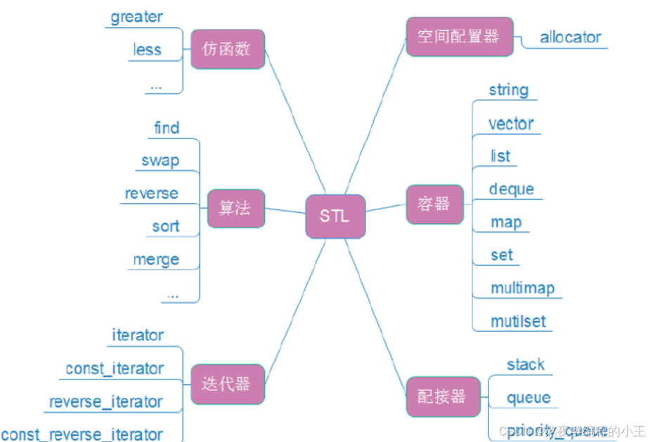容器(Containers):提供各种数据结构的实现,如向量(vector)、列表(list)、队列(queue)等。 迭代器(Iterators):为容器提供一种通用的方式来遍历和操作其中的元素。 算法(Algorithms):包括常见的排序、查找、修改等操作,如 sort()、find() 等。 函数对象(Function Objects):允许通过重载 operator() 定义自定义的函数行为。 配接器(Adapters):对现有的数据结构或算法进行调整,使它们具备新的行为,如 stack、queue 等。 分配器(Allocators):负责内存的分配与管理,为容器提供灵活的内存管理机制。