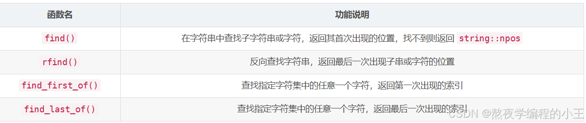 //在字符串中查找子字符串或字符,返回其首次出现的位置,找不到则返回 string::npos