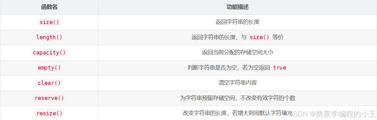 1. resize(size_t n) 与 resize(size_t n, char c)都是将字符串中有效字符个数改变到n个,不 同的是当字符个数增多时:resize(n)用'\0'来填充多出的元素空间,resize(size_t n, char c)用字符c来填充多出的元素空间。注意:resize在改变元素个数时,如果是将元素个数增多,可能会改变底层容量的大小,如果是将元素个数减少,底层空间总大小不变。 2. reserve(size_t res_arg=0):为string预留空间,不改变有效元素个数,当reserve的参数小于string的底层空间总大小时,reserve不会改变容量大小。 3. size和capacity都不包括’\0’。