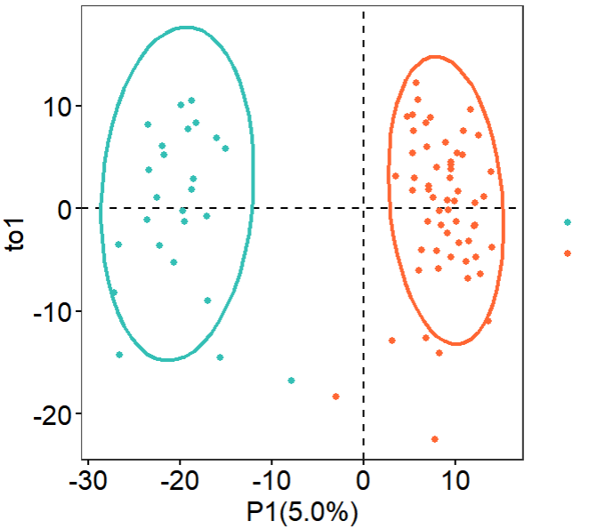 oplsda = opls(exp, group_list, predI = 1, orthoI = NA)
