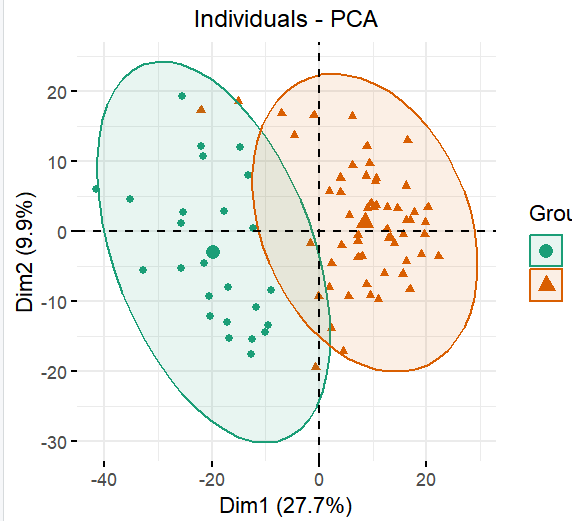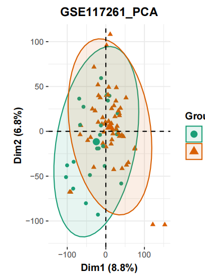 可以很明显的看到,两个分组这个时候区分度并不是很好,值得注意是主成分分析(PCA)是一种无监督学习算法 ,算法尝试从数据中发现模式和结构,而无需预先标记的目标变量。PCA旨在通过找到数据中的主要方差方向来降低数据的维度,从而实现数据的降维和特征提取。最开始我们的表达量矩阵是两三万个基因在83个样品(58 PAH and 25 control )的表达量信息,以为基因数量实在是太多了,我们很难使用其中的几个或者多个来量化这些样品的距离,所以主成分分析(PCA)就派上了用场,上面的散点图就是可视化了主成分分析(PCA)的前两个主成分。