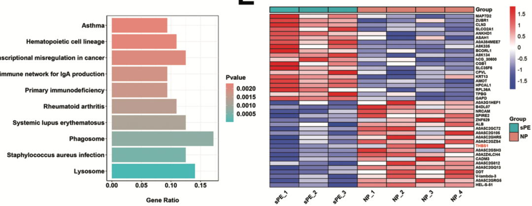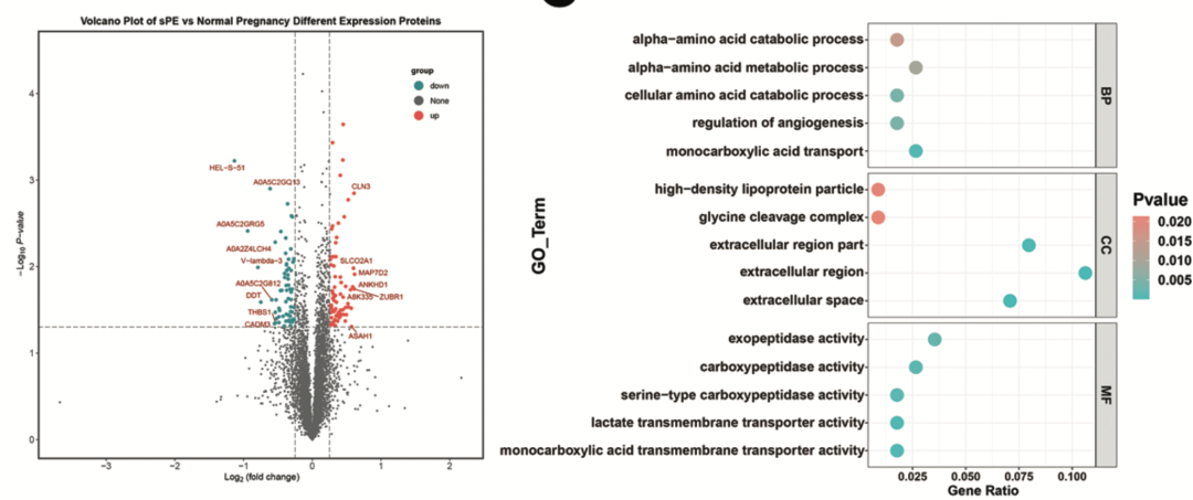 这个研究的实验设计是对七个胎盘样本(包括三例重度PE患者和四例正常孕妇)进行了TMT定量蛋白质组学分析,差异分析的结果是:74个上调蛋白和66个下调蛋白(sPE/NP倍数变化>1.2或<0.83,p<0.05),如下所示的火山图和go数据库的注释结果:
