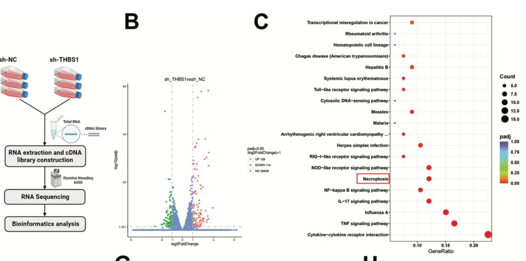 但是这个文章做的是sh-THBS1和sh-NCHTR8/SVneo两分组的RNA-seq,差异分析后拿到了238个DEGs,其中128个上调基因和110个下调基因,如下所示的火山图和kegg数据库注释结果: