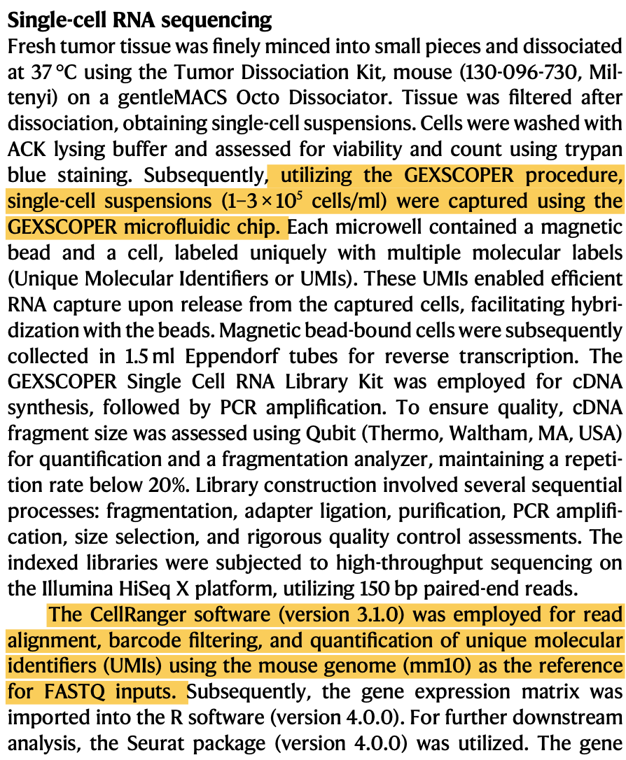 那么,上面的4个样品,是因为没有裁剪吗?就需要读一下上面的 CRA011974 数据集对应的文章了:《ITGB6 modulates resistance to anti-CD276 therapy in head and neck cancer by promoting PF4+ macrophage infiltration》,注意到里面的单细胞技术根本就不是10x,而是国产的新格元: