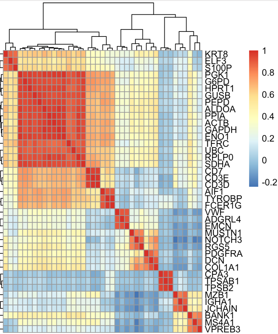 我们可以简单的看看管家基因(Housekeeping genes)是否有跨越细胞亚群的高度相关性,是一类在细胞中表达水平相对稳定的基因,它们通常参与细胞的基本生理过程,如能量代谢、DNA复制和细胞骨架维持: