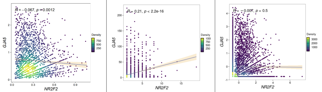 但是,实际上,如果大家是做真正的单细胞水平相关性分析,无论取什么样的表达量矩阵怎么做都是不合理的!