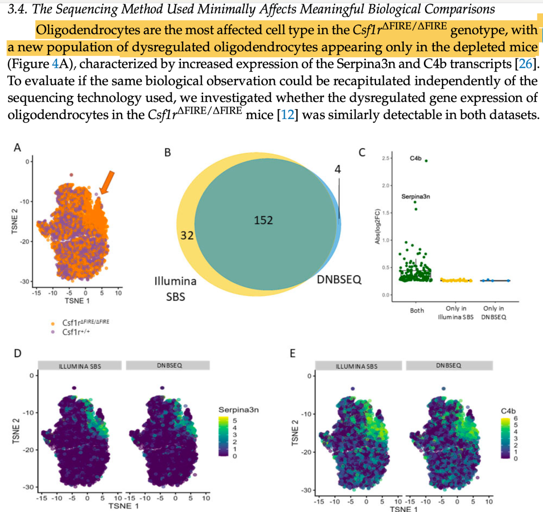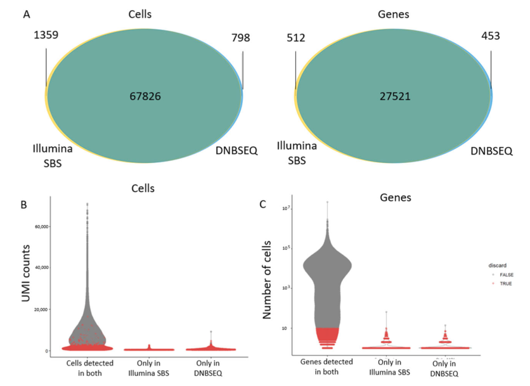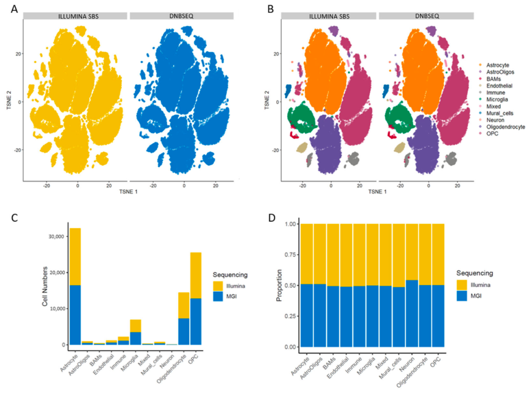 但是我看到了一个英国课题组做的研究,标题是《Illumina SBS Sequencing and DNBSEQ Perform Similarly for Single-Cell Transcriptomics》,作者是Nadine Bestard-Cuche等人,2024年底发表在《Genes》期刊上。这篇研究的主要目的是比较两种不同的高通量单细胞RNA测序(scRNA-seq)技术:Illumina的合成测序(Sequencing by Synthesis, SBS)技术和MGI的DNA纳米球测序(DNA nanoball sequencing, DNBSEQ)技术在单细胞转录组学中的性能。简单的读一下文献就可以看到结果和结论都表明两个不同的测序仪压根就对单细胞转录组结果并不会有什么影响: