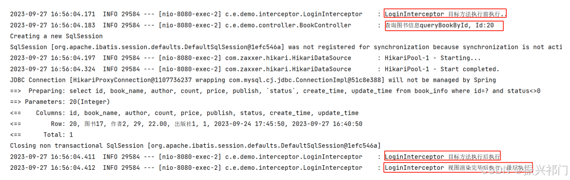 }我们启动服务,试试访问任意请求。观察后端日志。 可以看到 preHandle方法执行就放行了。开始执行目标方法。目标方法执行完成之后执行 postHandle和afterCompletion方法