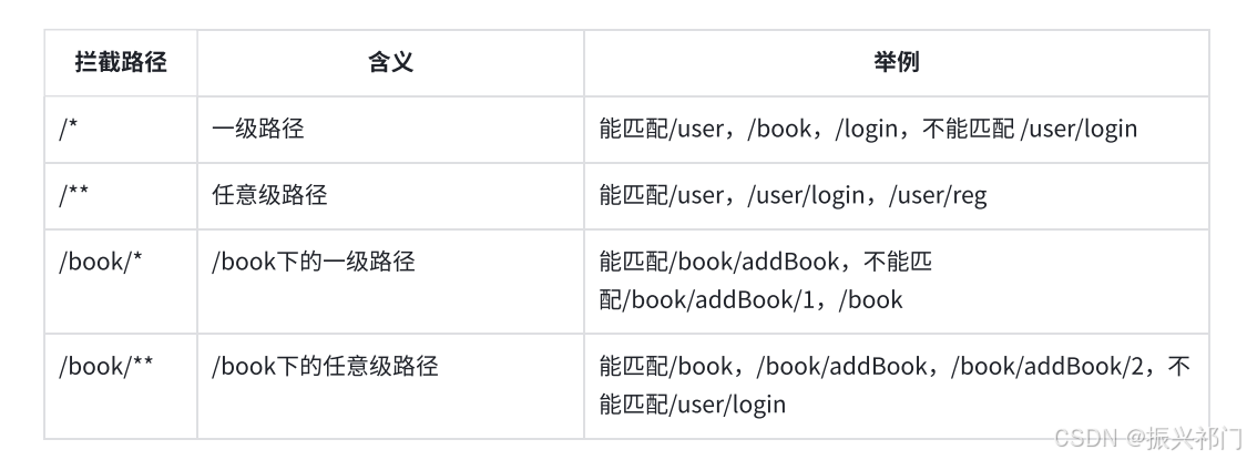 我在注册配置拦截器的时候, 通过 addPathPatterns() 方法指定要拦截哪些请求. 也可以 通过 excludePathPatterns()方法指定不拦截哪些请求. 在拦截器中除了可以设置 /** 拦截所有资源外,还有一些常见拦截路径设置: