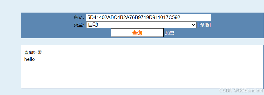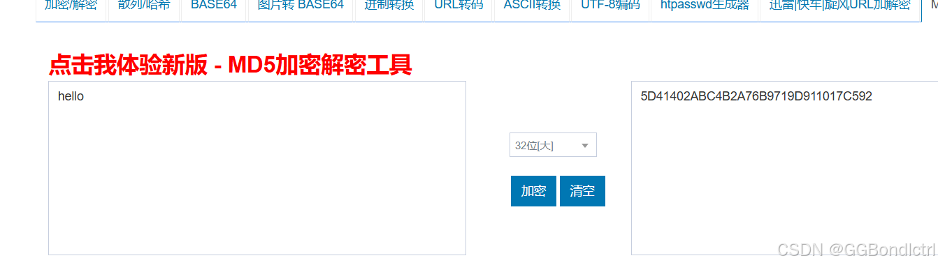很明显这里的“hello”的MD5值就是“5D41402ABC4B2A76B9719D911017C592”