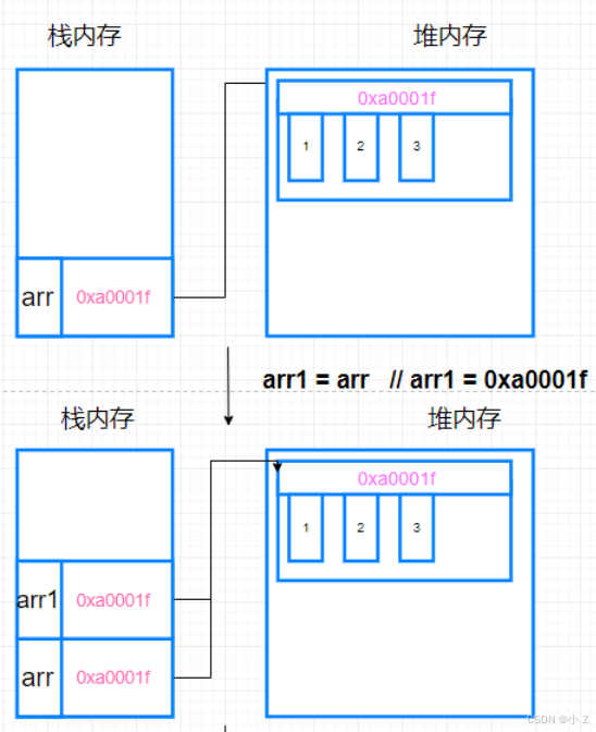 然后,执行 var newArr = arr;,这意味着 newArr 保存了与 arr 相同的引用。也就是说,newArr 和 arr 都指向了相同的内存地址,这个内存中存储的是数组 [1, 2, 3]。