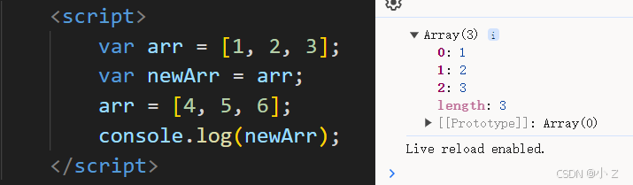 在 JavaScript 中,对象、数组等复杂数据类型的变量并不直接保存数据的值,而是保存引用。当我们对变量重新赋值时,我们只是改变了它指向的内存地址,而原来的引用仍然有效。这也是为什么在打印 newArr 时,它依旧指向 [1, 2, 3]。