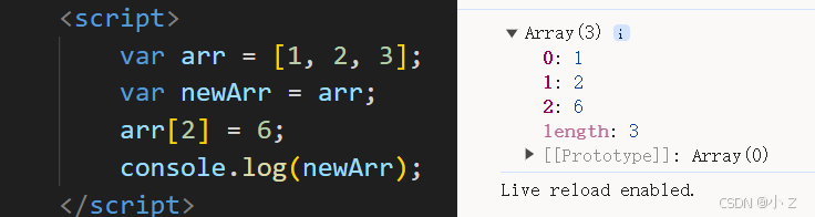 在代码中,var arr = [1, 2, 3] 创建了一个数组 [1, 2, 3],并且将其引用赋值给变量 arr。此时,arr 保存的是数组在内存中的引用(地址),而不是数组的值本身。