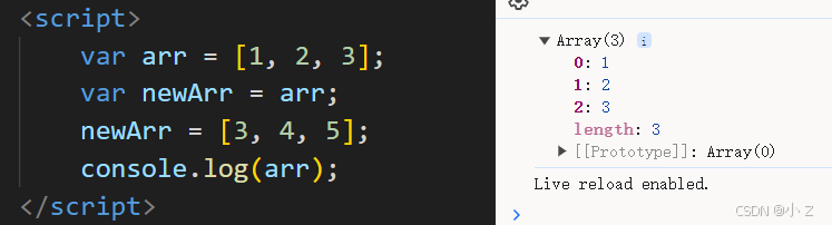 当我们执行 newArr = [3, 4, 5]; 时,newArr 被重新赋值,指向了一个新的数组 [3, 4, 5] 的内存地址。此时,newArr 不再指向原来的数组 [1, 2, 3],而是指向了一个全新的数组。而 arr 依然保持指向原始数组的引用,因此打印 arr 时结果仍然是 [1, 2, 3]。