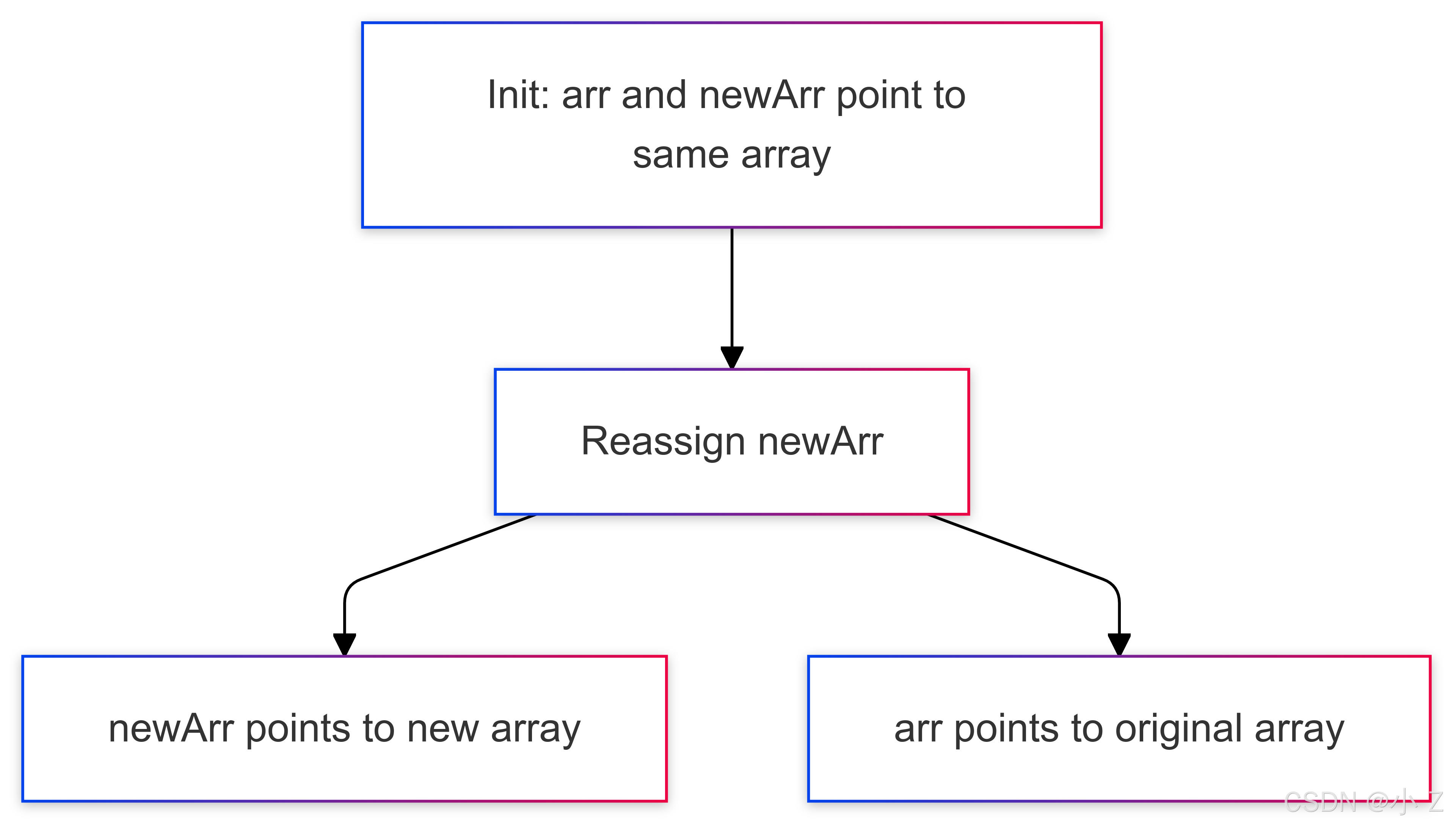 arr 和 newArr 都指向 [1, 2, 3]。newArr 指向新的数组 [3, 4, 5]。arr 依然指向原数组 [1, 2, 3]。