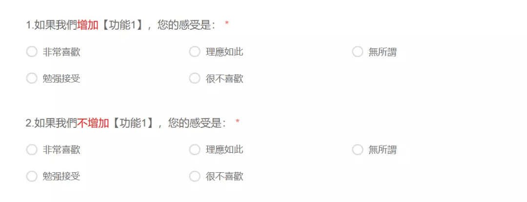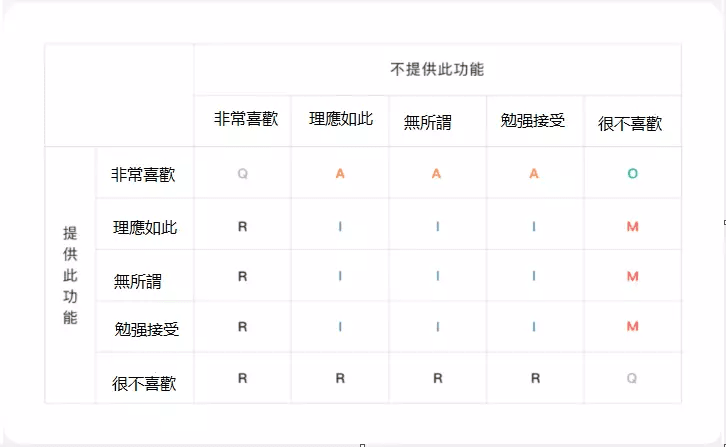 按照使用者对「增加功能态度」与「不增加功能态度」最终可定位某功能对于使用者来说是什么需求