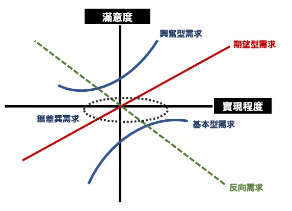 此模型将用户需求分为五类:必备型需求(Must-be)、期望型需求(One-dimensional)、魅力型需求(Attractive)、无差异型需求(Indifferent)和反向型需求(Reverse)。