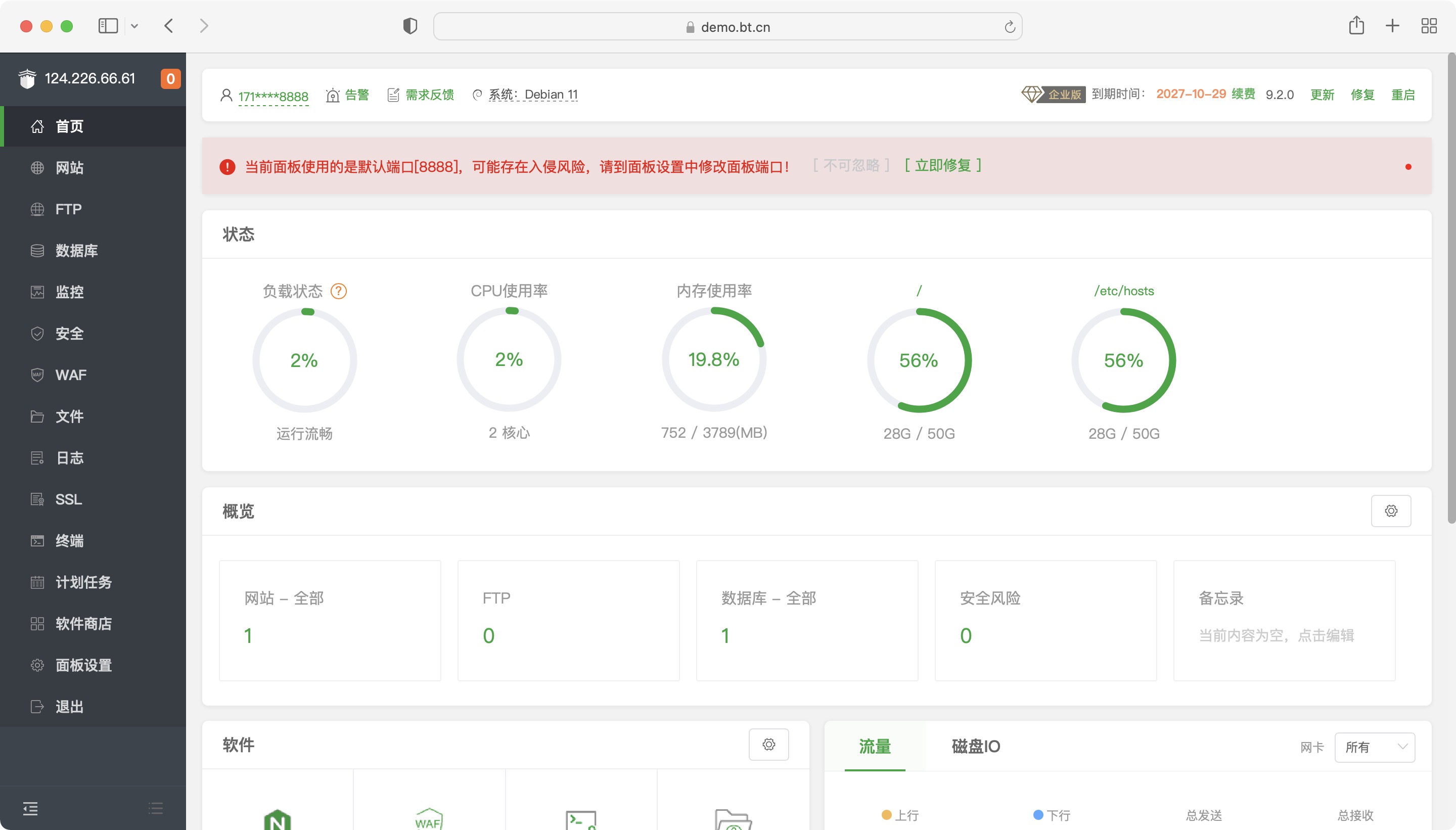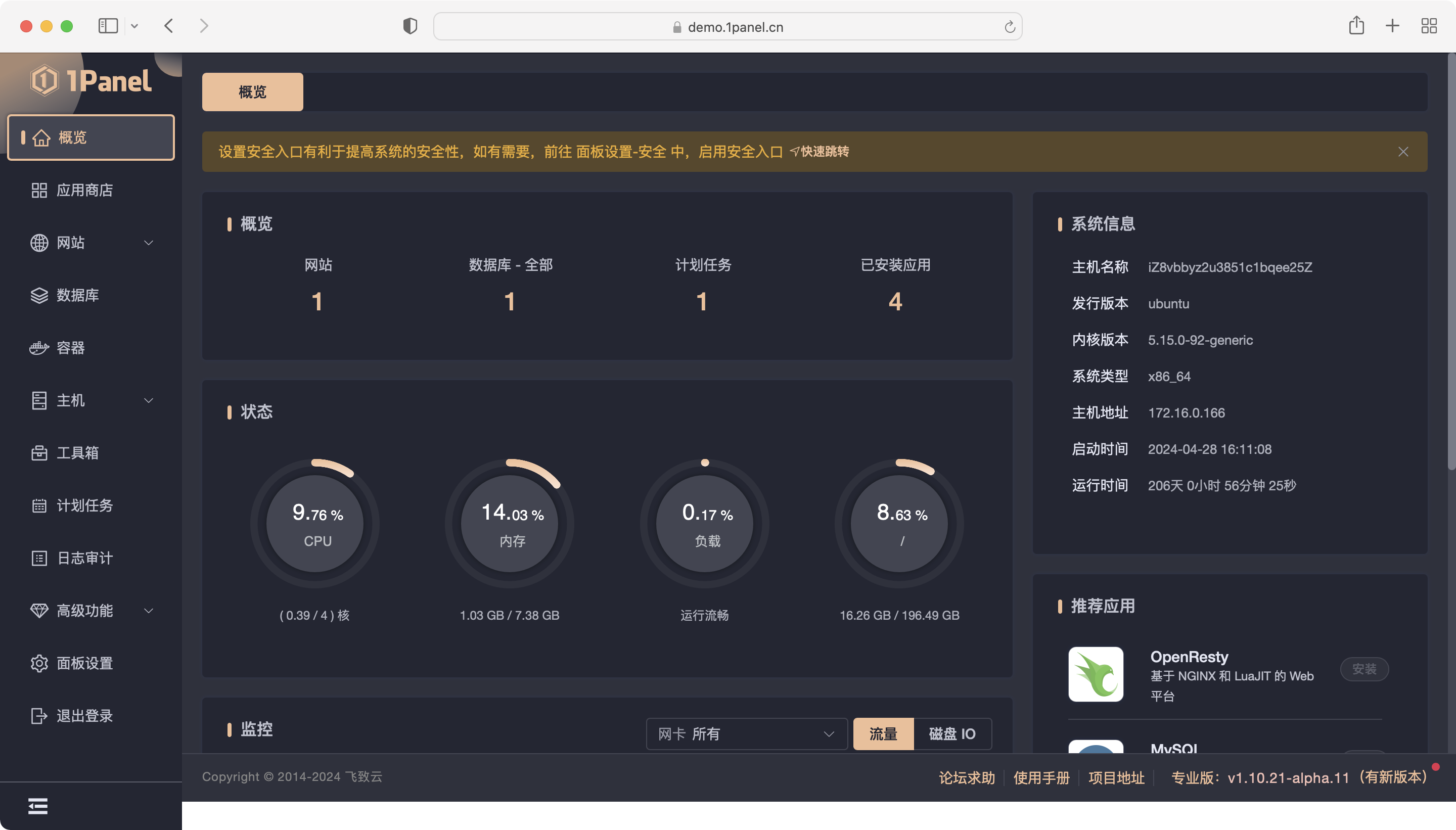 1Panel支持WordPress、Halo等主流建站软件的快速部署与配置,同时集成了域名绑定与SSL证书配置功能,确保网站构建过程的安全性与便捷性。在主机监控方面,1Panel 提供了实时的性能监控服务,覆盖CPU使用率、内存占用、磁盘输入输出(IO)等关键系统指标,并允许用户自定义监控项与报警规则,确保服务器资源得到精细管理与及时响应。