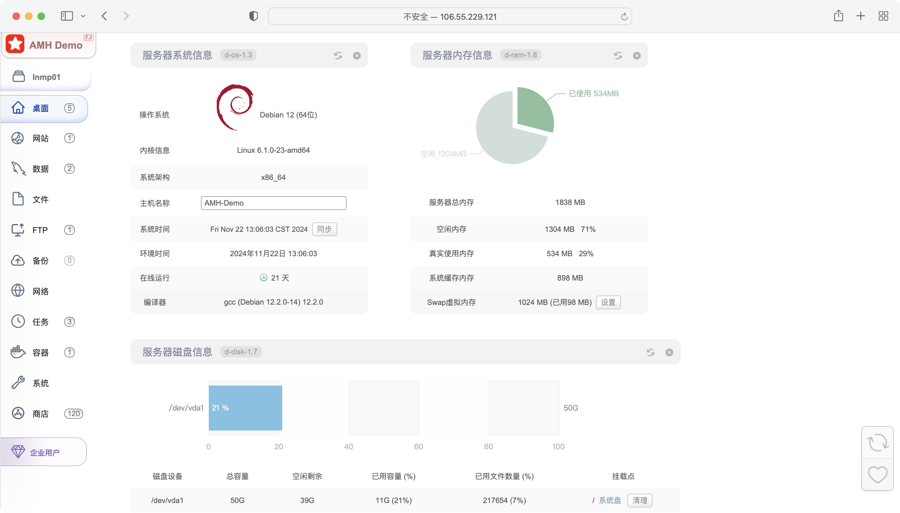 AMH面板支持LNMP(Linux + Nginx + MySQL + PHP)、LAMP(Linux + Apache + MySQL + PHP)等多种主流应用环境的快速部署,通过一键安装与配置功能,极大地简化了应用环境的搭建流程。在服务器监控方面,AMH面板提供了全面的实时性能监控服务,覆盖CPU使用率、内存占用、磁盘输入输出(IO)等关键系统指标,并支持用户自定义监控项与报警规则,确保服务器资源得到精细管理与及时响应。